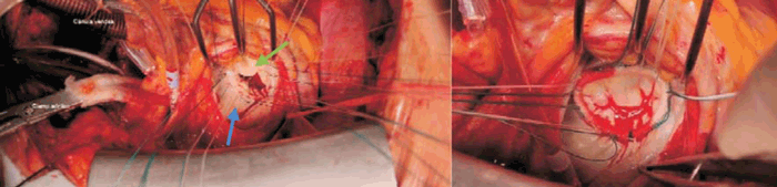 Figura 7: Izquierda: abordaje de la válvula mitral a través de una atriotomía izquierda paralela al surco interauricular (en este caso una mega aurícula, por lo que la visión es muy favorable). Pueden observarse los puntos de sutura para el anclaje de un anillo protésico de plastia (aún no implantado) en todo el perímetro del anillo mitral nativo. En este caso el anillo nativo está severamente dilatado en sentido ántero-posterior, impidiendo la correcta coaptación de los velos anterior y posterior (velos superior e inferior respectivamente en la foto). La flecha verde señala la topografía del trígono y la comisura ántero-lateral, próxima al sistema de conducción. La flecha azul señala el sector posterior de anillo mitral y su relación con el surco aurículo-ventricular, la arteria circunfleja y el seno coronario. Derecha: se observa el anillo protésico implantado, las suturas de anclaje anudadas y una correcta coaptación de los velos mitrales.