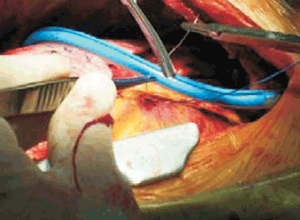 Figura 8: Drenaje mediastinal (azul), que se extrae por contraabertura para ser conectado a un frasco de drenaje. También se observa el electrodo de marcapasos transitorio que se implanta en el miocardio. Permite estimular el corazón en caso de necesidad en el intra y posoperatorio inmediato.