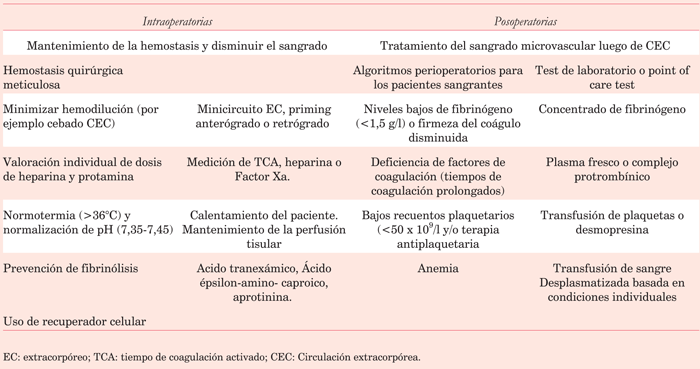 Tabla 7: Intervenciones intra y posoperatorias para evitar el sangrado excesivo en cirugía cardíaca. Modificado de(68).