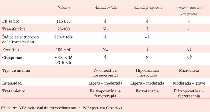 Con niveles de Hb <12 g/dl en mujeres y 13 g/dl en hombres se considera útil analizar los parámetros hematimétricos, poniendo énfasis en el volumen corpuscular medio, metabolismo de hierro y en caso de necesidad, titular vitamina B12, ácido fólico y perfil inflamatorio (proteína C reactiva y VES).