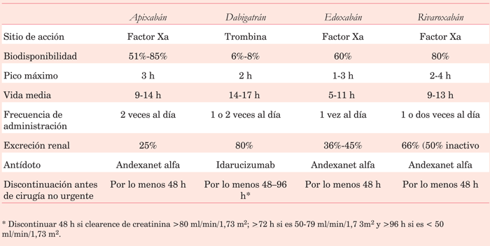 Respecto al tratamiento anticoagulante oral, tiene especial interés el manejo de los fármacos antivitamina K en situaciones de urgencia. Se debe suspender el medicamento y administrar vitamina K 5-10 mg IV. En caso de emergencia, (trasplante cardíaco, disección de aorta) se requiere reposición con plasma fresco congelado y/o complejo protrombínico (indicación clase I, nivel de evidencia C)(10) La dosis única de complejo protrombínico se administra si INR >3, 30 U/kg; y si INR <3, 10 U/kg. Los anticoagulantes orales directos deben suspenderse al menos 48 h antes de la cirugía (tabla 4). Respecto a los test básicos de la coagulación: dabigatrán altera el tiempo de trombina, mientras que rivaroxabán, apixabán y todos los compuestos anti-X, pueden alterar el tiempo de protrombina. La determinación de su concentración plasmática (no disponible en nuestro medio) permite realizar la cirugía cuando es <30 ng/ml, y sería necesario posponerla 12 h frente a concentraciones de 30-200 ng/ml y 24 h entre 200-400 ng/ml.