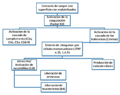 La respuesta inflamatoria es el resultado de la actuación sinérgica de los tres grandes sistemas humorales de protección del organismo: sistema de coagulación (factor XII de Hageman), sistema de las cininas y sistema de activación del complemento. Esta respuesta es autolimitada y tiende a normalizarse en las primeras 12–24 h del posoperatorio, dependiendo del tiempo de clampeo aórtico, de CEC y del tipo de cirugía. Se pueden evidenciar dos fases, una inicial proinflamatoria con incremento en la actividad celular (leucocitosis de todas sus líneas celulares) con la consecuente degranulación y posterior disminución en la actividad de estas células. Esta fase está en íntima relación con el contacto de la sangre con superficies extrañas, activación del sistema del complemento, el sistema de calicreínas-fibrinólisis y el sistema de la coagulación. Se genera una respuesta difusa con elevación marcada del complemento, principalmente las anafilotoxinas C3a y C5a(21), lo cual lleva a activación, migración y degranulación de los polimorfonucleares (PMN), activación de linfocitos T y B, y producción de interleukinas (IL)(22), específicamente IL 1, IL 6 e IL 8(19). Es de destacar que los niveles pico de IL 6 se correlacionan con el grado de disfunción miocárdica y con el tiempo de clampeo(23). Durante esta fase se observan las secuelas pulmonares que van desde hipoxemia leve hasta distrés respiratorio severo, síndrome de fuga capilar con incremento de la permeabilidad, lesión plaquetaria, hemólisis y fibrinólisis.