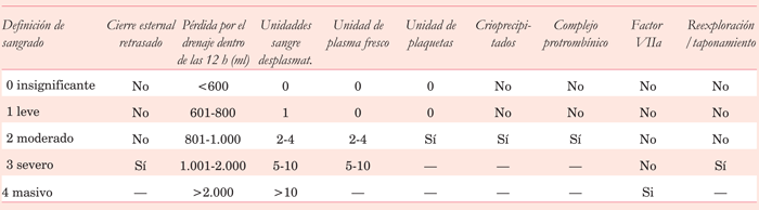En 2014 se propuso por un comité de expertos(47) el uso de una definición universal de sangrado perioperatorio en CC de adulto para estandarizar la nomenclatura, mejorar las definiciones y ayudar en trabajos futuros. Usando solo parámetros clínicos relevantes, se crea un sistema de cinco clases que puede ser aplicado tanto en la práctica diaria como en investigaciones clínicas. Es un instrumento en la mejora de la calidad, y una herramienta útil para proponer, evaluar e implementar soluciones adaptadas a cada centro, para reducir el sangrado y las necesidades de transfusión. Está basado en siete eventos que ocurren en la cirugía o en el primer día de posoperatorio (tabla 5).