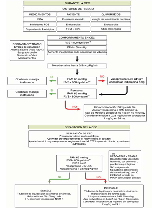 Figura 1: Algoritmo propuesto de manejo para el SV. TEE: ecocardiograma transesofágico; FEVI: fracción de eyección del ventrículo izquierdo; CEC: circulación extracorpórea; HCTO: hematocrito; IECA: inhibidores de la enzima conversora de angiotensina; PAM: presión arterial media; PDE: fosfodiesterasa; PTGP: plano transgástrico profundo; RVS: resistencias vasculares sistémicas; IC: índice cardíaco; SV: síndrome vasopléjico(1).