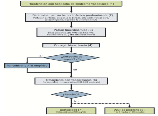 Una vez que el cuadro se ha instalado, se propone el siguiente algoritmo terapeútico: la NA es el vasopresor de primera línea. El objetivo es lograr una PAM de 65 mmHg. Si es necesaria una dosis de NA superior a 0,5 gamas/kg/min, se recomienda el inicio de vasopresina en infusión continua. La terlipresina, en bolo de 1 mg, es una alternativa, aunque se requiere mayor evidencia para poder recomendar su uso. El azul de metileno se reserva para aquellos casos en los que se requiere una dosis de NA superior a 0,5 gamas/kg/min, junto a dosis altas de vasopresina, para mantener la PAM objetivo. En este escenario, se administra un bolo de azul de metileno de 2 mg/kg como terapia de rescate, lográndose, en la mayoría de los pacientes, un aumento significativo de las RVS, y un descenso significativo del soporte hemodinámico. En caso de persistencia de la situación de vasoplejia, se procederá a iniciar una perfusión de azul de metileno a 0,25 mg/kg/h. En este contexto, podría ser razonable la administración de hidrocortisona de 50-100 mg cada 6 h (deficiencia absoluta o relativa de cortisol). En pacientes con riesgo de síndrome serotoninérgico, se considera a la hidroxicobalamina como una alternativa al azul de metileno(9). Además de este manejo inicial en base a volumen, vasopresores, azul de metileno y corticoides, frente a un cuadro de shock distributivo es pertinente realizar una ronda de cultivos, e iniciar un tratamiento antibiótico empírico. La sospecha de infección será más alta en aquellos pacientes que estuvieron internados previamente, o cuando el estado inflamatorio comienza varios días después de la cirugía. Esto se refleja en el segundo algoritmo de tratamiento representado en la figura 2(10).