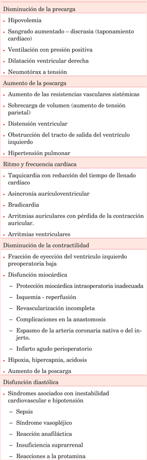 Disfunción sistólica del VI: la disminución de la FEVI puede deberse a pérdida de miocitos (por necrosis o apoptosis) o a una disfunción de estos, transitoria o definitiva. Como mencionamos previamente, la disfunción sistólica previa, tanto isquémica como de cualquier otra etiología, predispone a la aparición del síndrome. Los fenómenos provocados durante la cirugía generan un estado de atontamiento, en general transitorio, que puede comprometer el GC(8). La respuesta a la precarga también está disminuida, y una poscarga aumentada puede causar caída de la función sistólica(6) (tabla 1).
