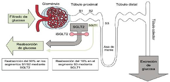 La glucosa filtrada a nivel renal es absorbida en el TCP a través de los SGLT2 (cotrasportadores Na/Glucosa). Su inhibición por los iSGLT2 (inhibidores de los SGLT2) provoca la excreción de glucosa y sodio.