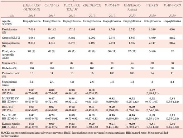 Un metaanálisis publicado por Zelniker y colaboradores(17) en el año 2019 que incluyó el Empa Reg Outcome, el Programa Canvas y el Declare-Timi 58, con 34.222 pacientes con DM2, 60% con ECVe, 20% con ERC y 12% con IC y con seguimiento promedio de 3,2 años, concluyó que los iSGLT2 disminuyeron el objetivo combinado de muerte CV, infarto/stroke 11% (exclusivamente en el subgrupo de pacientes con ECVe), muerte CV u hospitalizaciones por IC 23% y 45% la progresión de la enfermedad renal; estos últimos dos objetivos independientemente de la presencia de ECVe.