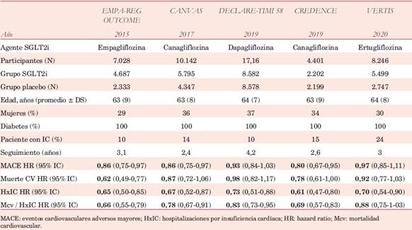 Recientemente fue publicado un quinto trabajo en pacientes con DM2 con una cuarta gliflozina, la ertugliflozina, el Vertis CV(19). Este estudio enroló 8.246 pacientes a ertugliflozina versus placebo con un seguimiento a 3,5 años. El diseño fue similar al de los otros ensayos con un objetivo primario de no inferioridad combinado de mortalidad CV, infarto o stroke y un objetivo secundario también combinado de muerte CV u hospitalización por IC. El objetivo primario y el secundario no mostraron superioridad de la ertugliflozina con respecto al placebo, pero sí se observó disminución de las hospitalizaciones por IC. Los autores en la discusión manejan dos hipótesis para explicar las diferencias en los resultados respecto a las otras gliflozinas: la mejoría del tratamiento farmacológico basal de los pacientes enrolados o la ausencia de un efecto de clase.