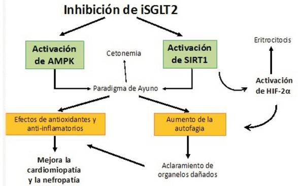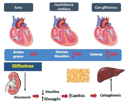 Las cetonas son la fuente de energía más eficiente, pero sólo son producidas en situaciones de ayuno o “ayuno símil”, como son el ejercicio intenso, las dietas cetogénicas o la diabetes con mal control y aumento de la lipólisis (obtención de ácidos grasos a partir de los triglicéridos). Las cetonas son el beta hidroxibutirato, la acetona y la acetoacetato, producidas a nivel hepático y liberadas al torrente sanguíneo. En situaciones normales en las que existen concentraciones elevadas de insulina y esta puede ser utilizada, la lipólisis y la cetogénesis se encuentran inhibidas; por el contrario, situaciones que provoquen una disminución de la insulina, estimulan la cetogénesis. Los órganos que más utilizan las cetonas como fuente de energía son el cerebro, el corazón y los riñones. La obtención de ATP a partir de cetonas, como el beta hidroxibutirato, es 31% más efectiva y 27% menos costosa que la obtenida a partir de los ácidos grasos. Los iSGLT2 al provocar glucosuria y generar una disminución de la insulina plasmática estimulan la glucogenólisis y la cetogénesis hepática, a la vez que disminuyen la aclaración de cetonas por el riñón generando un mecanismo de obtención de energía más efectivo para el miocardio y el riñón.