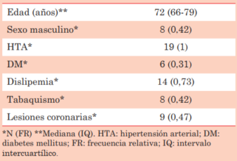Se analizaron 19 pacientes, con una mediana de tiempo de realización del PET de 16,3 meses (15,9-16,9) luego de la SVA. Las características basales de la población se muestran en la (tabla 1). La mediana de edad de la población fue de 72 [66-79] años, 8 (frecuencia relativa [FR] 0,42) eran de sexo masculino y se destaca la presencia de una importante prevalencia de factores de riesgo cardiovasculares: 19 hipertensos (FR 1), 6 diabéticos (FR 0,31), 14 dislipémicos (FR 0,73) y 8 tabaquistas (FR 0,42).