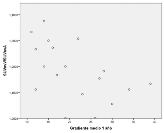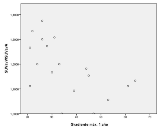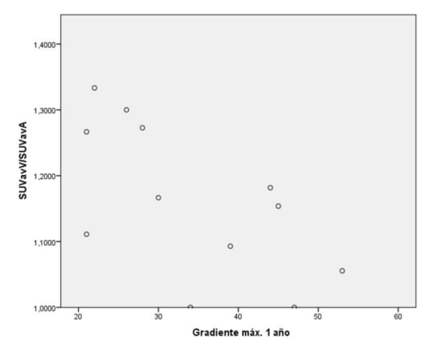 En este análisis se encontró también una correlación negativa moderada estadísticamente significativa (Rho de Spearman, coeficiente de correlación -0,589) entre la captación de 18Ffluoruro en el PET y el gradiente medio al año (p = 0,044), así como entre la captación y el gradiente máximo al año (Rho de Spearman, coeficiente de -0,611, p = 0,035) (figura 3) y (figura 4).