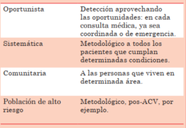 El objetivo principal de la detección de FA es poder identificar la población con mayor riesgo de ACV para establecer una terapia preventiva efectiva y segura, que en la mayoría de los casos implica el uso de anticoagulantes orales. Las nuevas tecnologías han simplificado la monitorización, pero el rendimiento de la estrategia a utilizar debe adaptarse a cada situación particular. En la (tabla 1) se resume la definición de las principales estrategias utilizadas extractadas de los documentos de consenso de las principales sociedades científicas del mundo(9).