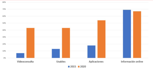 ¿Cuál es la aceptación de la sociedad en cuanto al uso y preferencias de esta tecnología disponible en salud? Más allá de la información existente sobre las características de nuestro país y las opiniones de los pacientes y operadores que resumimos en anterior publicación(10), internacionalmente y según datos de la Encuesta de consumidores realizada por el Centro Stanford en Salud Digital(11), globalmente el uso de medios digitales en salud creció más de 10% entre 2019 y 2020. Este porcentaje incluye la videoconsulta, la utilización de dispositivos portátiles usables o ponibles (wearables) y el seguimiento de parámetros a distancia. Particularmente y comparando en este caso entre los años 2015 y 2020, el uso de la videoconsulta pasó de 7% a 43%, el uso de dispositivos de 13% a 43% y el uso de aplicaciones para control de parámetros (pasos, actividad, etc.) de 18% a 54%. No menos importante es la comprobación que 2/3 de los pacientes buscan información en internet sobre su patología, síntomas o tratamientos (figura 1). En el mismo período se detecta, además del aumento significativo de la videoconsulta, una disminución de las consultas telefónicas y del contacto a través de mensajes de texto o correo electrónico. El 70% de los consultados manifestaron el deseo de poder compartir los datos colectados en sus aplicaciones (de actividad física, control del peso, control de diabetes, por ejemplo) con sus médicos.
