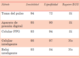 El desarrollo tecnológico ha puesto a disposición una gran variedad de dispositivos que facilitan la detección de FA(21). Se ha reportado la existencia de más de cien mil apps y de más de cuatrocientos dispositivos portátiles para la monitorización de parámetros cardiovasculares(6). Los sistemas más sencillos son apps para celulares inteligentes, muchas gratuitas, disponibles para todos los sistemas operativos. Usan fotopletismografía (PPG), tecnología similar a la usada por los oxímetros, a través de un haz de luz y la cámara del teléfono, registran la onda de pulso pudiendo así definir su irregularidad. Son de uso muy amigable, sencillas y no hacen necesario ningún entrenamiento especial. Estos sistemas requieren, al igual que los métodos clínicos antes mencionados, la confirmación con un ECG. Aunque su sensibilidad y especificidad son buenas, sin duda los dispositivos que permiten registrar una derivación del ECG son superiores y, además, no requieren de la confirmación con un ECG completo. En las últimas guías clínicas de la Sociedad Europea de Cardiología (ESC) se establece (recomendación clase I) que el diagnóstico de FA puede hacerse en base al registro de un ECG de 12 derivaciones o un registro de 30″ de una derivación del ECG(6). En la (tabla 2) se resumen la sensibilidad y la especificidad de estas diferentes metodologías.