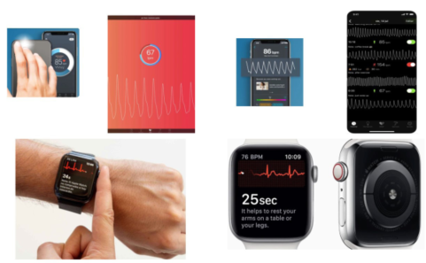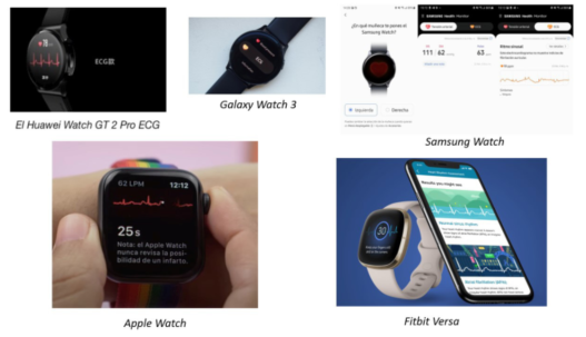 Existe un gran desarrollo y competencia en diversos fabricantes de relojes inteligentes. Algunos permiten no solo el registro del ECG, una o más derivaciones durante 30″, sino también de la presión arterial y de la saturación de O2. Varias empresas conocidas los han desarrollado: Samsung, Garmin, Huawei, Fitbit, Galaxy y otras (figura 4). El más conocido y estudiado es el Apple Watch ® que usando tecnología PPG registra un tacograma y mide los intervalos pico a pico que interpreta como RRs. Aplicando un algoritmo propio puede determinar su regularidad. Sin embargo, la precisión de este algoritmo para definir FA puede estar comprometida por la presencia de extrasístoles o por el movimiento. Pero, además, incorporando la tecnología del sistema KardiaMobile de AliveCor®, es posible registrar una derivación del ECG a través de un circuito establecido entre un detector ubicado en la parte inferior en contacto con la piel y un dedo apoyado en la perilla. Una vez registrados los 30″ del ECG genera automáticamente un reporte y es almacenado en el celular vinculado desde donde puede disponerse. Es conveniente hacer el registro en reposo para una mejor definición (figura 5).