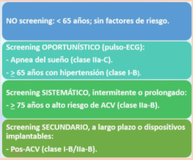 La eficacia y el rendimiento del screening dependen de la población objetivo, del método utilizado en cuanto a su certeza diagnóstica y de los costos de su aplicación. Los factores de riesgo que deben considerarse para seleccionar la población a valorar son básicamente los incluidos en el score CHA2DS2VASc de estimación del riesgo de ACV.