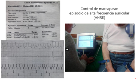En pacientes portadores de marcapasos o cardiodesfibriladores que permiten el registro de la actividad auricular (catéter atrial o electrodos proximales para sensado en electrodo ventricular) se pueden detectar episodios de frecuencia rápida auricular, Atrial High Rate Episodes (AHRE, por su sigla en inglés). Integran el espectro de la llamada FA subclínica, aunque a veces se utilizan estos términos como sinónimos. Si bien no existe un límite específico de frecuencia, habitualmente los dispositivos lo definen por defecto como una frecuencia > 175 pm. Debido a su intermitencia y a veces corta duración, es casi imposible detectarlos por métodos de registro externos. Constituye una recomendación clase I en las guías de FA de la ESC 2020(6) que al controlar periódicamente marcapasos y cardiodesfibriladores se revisen los electrogramas auriculares almacenados y se confirme si se trata de AHRE, valorando su incidencia general, duración, aspectos que además ayudan a determinar la “carga” de FA (figura 8).