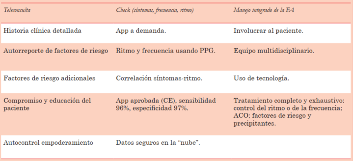Al inicio de la pandemia por coronavirus la clínica de FA del Centro Médico de la Universidad de Maastricht canceló las consultas presenciales de los pacientes con FA que pasaron a realizarse en formato de teleconsulta. En apoyo a esta modalidad de relación con el paciente se instrumentaron recursos de mSalud para monitorización del ritmo y la frecuencia cardíaca usando apps, proyecto denominado TeleCheck-AF, que se fundamentó en tres pilares: la teleconsulta, el control del ritmo y frecuencia y el enfoque multidisciplinario(40) (tabla 4).
