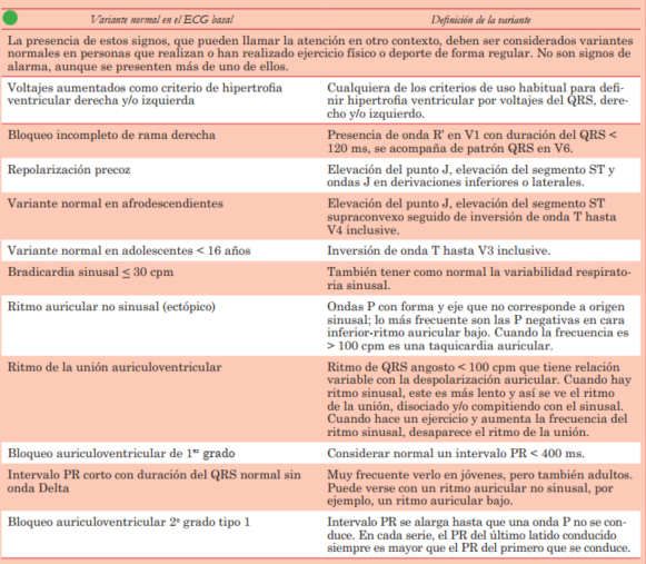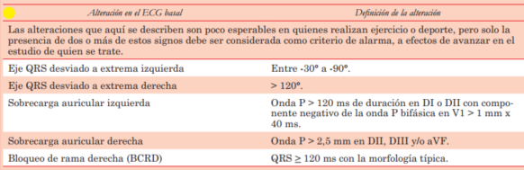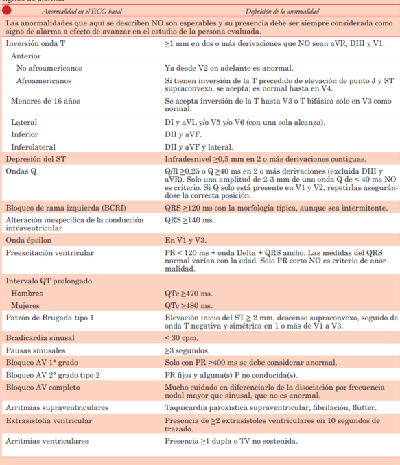 Modificando las tablas de la publicación de Sharma y col.(16), se presentan criterios electrocardiográficos a los que se debe prestar especial atención. Hay signos que deben ser considerados normales en quienes realizan actividad física importante (tabla 1), signos que solo deben ser considerados de alarma si se están presentes más de uno asociados (tabla 2) y signos que por sí solos son de alarma y deben llevar al diagnóstico de ECG anormal (tabla 3).
