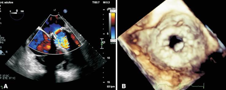 Como presentaba alto riesgo quirúrgico, de acuerdo con la voluntad del paciente en diálogo con el Heart Team, se decidió realizar implante percutáneo de prótesis mitral por abordaje transeptal, dentro de bioprótesis mitral quirúrgica (ViV). El procedimiento, efectuado el 15 de enero de 2021, se realizó bajo anestesia general y monitorización por ETE permanente. El implante se realizó por vía venosa femoral derecha y por acceso transeptal, para lo que se puncionó el septum interauricular con aguja de Brockenbrough e introductor Agilis Nxt Deflectable. Se colocó guía Medtronic Confida 0,35 x 2,60 cm en el ventrículo izquierdo y luego un introductor Edwards Sheath de 14 Fr. Se dilató el septum interauricular con un balón de 20 x 40 mm, y se implantó una prótesis Edwards Sapien 3 n.o 23 a nivel del anillo de la bioprótesis disfuncionante (figura 3), durante marcapaseo ventricular rápido. No se observaron complicaciones inmediatas a la colocación, y se logró un resultado exitoso, con una prótesis normoposicionada, gradientes finales pico y medio de 13/7 mm de Hg, respectivamente, sin insuficiencia residual, septum interauricular con defecto de 4 mm, con flujo de izquierda a derecha, PSAP de 64 mmHg, sin aumento de gradientes en el tracto de salida del ventrículo izquierdo (TSVI) (figura 4). La paciente evolucionó de manera favorable y se le otorgó el alta al día siguiente. A los tres meses postimplante, relata mejoría de la clase funcional, sin sintomatología cardiovascular, con control ecocardiográfico que evidencia válvula normofuncionante.