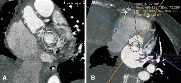 Paciente de sexo femenino de 72 años, con antecedentes de hipertensión arterial y cáncer de mama que requirió cirugía en 1996. Después, recibió tratamiento con quimio y radioterapia. Tiene diagnóstico de fiebre reumática en la niñez. En 2010, se realizó doble sustitución valvular por estenosis valvular mitroaórtica, se le implantó una bioprótesis St. Jude Epic n.o 21 en posición aórtica y otra St. Jude Epic n.o 25 en posición mitral; persistió con una leve insuficiencia periprotésica aórtica. En 2017, debido a una insuficiencia periprotésica severa y anemia por hemólisis, requirió sustitución quirúrgica de la bioprótesis aórtica por una bioprótesis St. Jude Epic Supra n.o 19. Se mantuvo, después, en clase funcional (CF) I de la New York Heart Association (NYHA). Respecto a la enfermedad actual, desde 2019 presenta deterioro progresivo de la clase funcional, con disnea de esfuerzo CF III y disnea de decúbito. En cuanto al examen físico cardiovascular, destaca el hallazgo de un soplo mesodiastólico con máxima intensidad auscultatoria en foco apical. Durante 2020, con planteo de disfunción valvular protésica, se realiza valoración en vistas a confirmar el diagnóstico, evaluar la etiología y planear el tratamiento. Mediante ecocardiograma transtorácico (ETT) y transesofágico (ETE) bi (2D) y tridimensional (3D) se constata aumento de gradientes transmitrales, gradientes pico de 28 mmHg y medio de 13 mmHg, engrosamiento del velo posterior con restricción de su apertura; se planteó el pannus como posible causa. Además, se detecta hipertensión pulmonar (HTP) severa con una presión arterial pulmonar sistólica (PSAP) estimada en 71 mmHg (figura 1). Se realiza luego una tomografía (TC) cardíaca, que apoya la presencia de pannus como mecanismo etiológico de la estenosis y ayuda a planificar el tratamiento (figura 2).