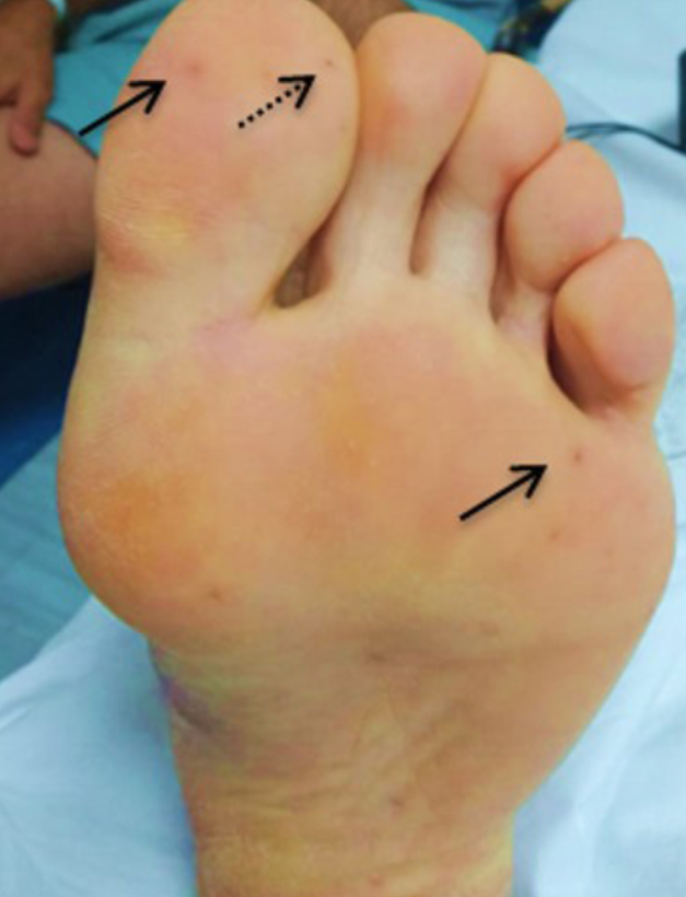 Se observan lesiones maculares purpúricas (flechas continuas) así como una lesión petequial (flecha punteada) a nivel del primer dedo.