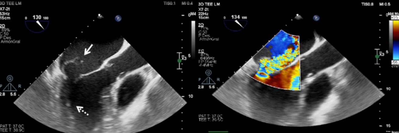 A. Ecocardiograma transesofágico a nivel de esófago medio. El eje largo del tracto de salida del ventrículo izquierdo está dilatado. La flecha continua indica flail de la valva menor de la válvula mitral. Se puede apreciar pequeña vegetación a nivel del aparato subvalvular (flecha punteada). B. Doppler color en el que se observa un jet de insuficiencia mitral severa excéntrica que ocupa gran parte de la aurícula izquierda que se encuentra dilatada.