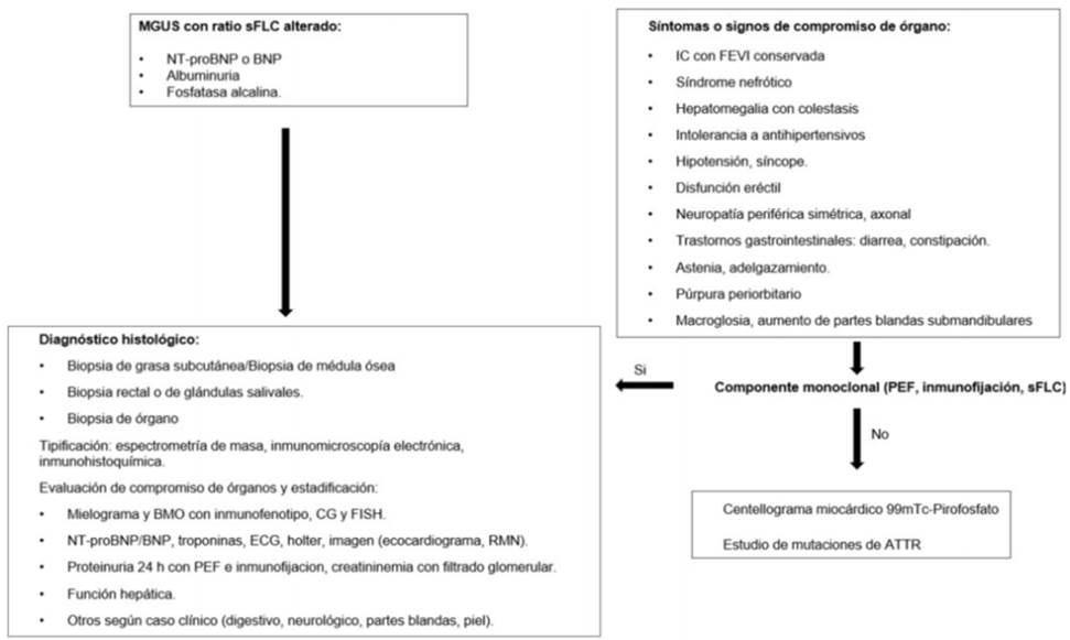 Se debe estudiar amiloidosis en toda gammapatía monoclonal de significado incierto con ratio FLC elevado que asocie albuminuria, fosfatasa alcalina elevada o aumento del NT-proBNP, así como en pacientes con IC con FEVI conservada.