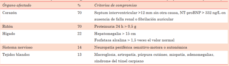 La sospecha clínica suele surgir de la presencia de insuficiencia cardíaca (IC) con fracción de eyección (FEVI) preservada, hipertrofia ventricular izquierda (HVI) no explicada, y/o evidencia de compromiso de otros órganos, como proteinuria, insuficiencia renal, neuropatía periférica, trastornos digestivos, sangrado y/o disautonomía como síntomas frecuentes(2,5).