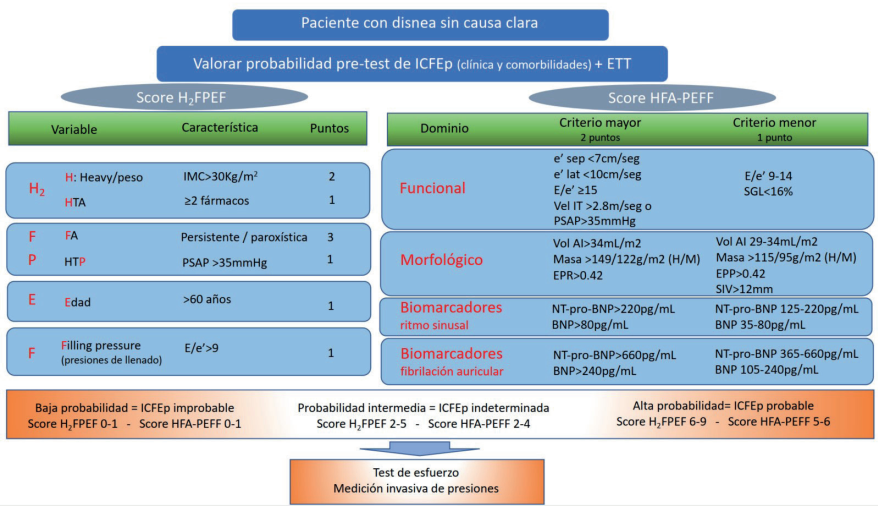 Las dificultades señaladas para el diagnóstico de ICFEp han llevado en los últimos años a la elaboración de algoritmos que utilizan criterios bayesianos y no dicotómicos, que determinan la probabilidad de que un paciente con disnea y FEp tenga IC.