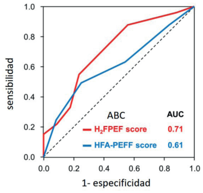 Curvas de ROC de scores H2FPEF y HFA-PEFF para predecir ICFEp. Tomado de Amanai(33). ABC: área bajo la curva.