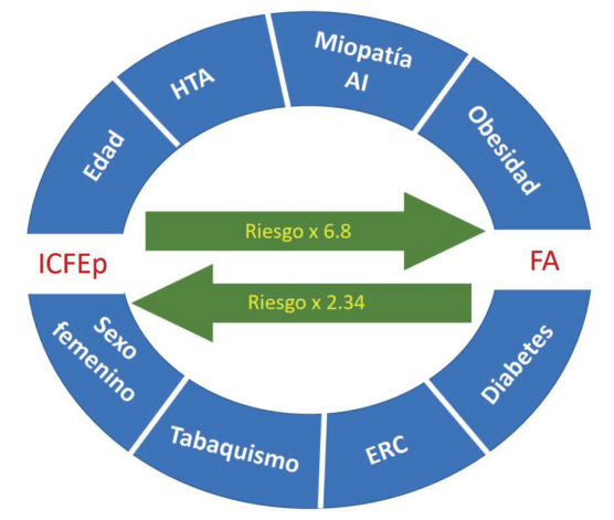 La relación entre ICFEp y FA (ICFEp-FA) tiene particularidades que la distinguen del resto de las comorbilidades. Si bien existe una correlación bidireccional entre ambas patologías, que hace que un paciente con FA tenga un riesgo aumentado de ICFEp y que un paciente con ICFEp tenga mayor riesgo de desarrollar FA, un paciente con ICFEp en ritmo sinusal también tiene un riesgo aumentado de desarrollar FA. La prevalencia de FA en los pacientes con ICFEp oscila entre 30-50% (Topcat, Emperor preserved, Paragon-HF) y la de ICFEp en los pacientes con FA con medición invasiva de presiones, la prevalencia es de 30-65%(56,57).