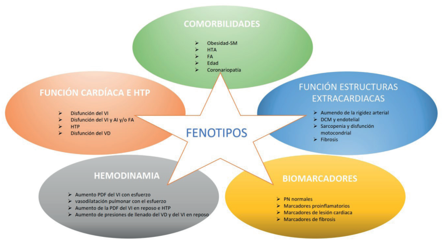 Borlaug et al. sugieren una forma de determinar el fenotipo de cada paciente tomando en cuenta las comorbilidades, la función cardíaca y vascular pulmonar, la situación hemodinámica, la función de estructuras extracardíacas y los biomarcadores(74) (figura 5).