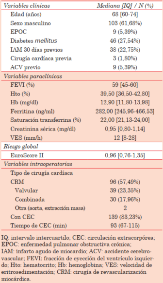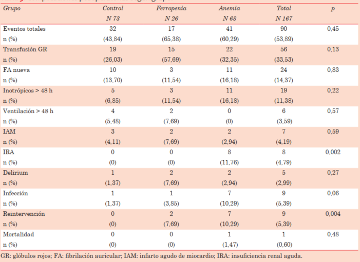 Resultados: se incluyeron 167 pacientes, mediana y distancia IQ 68 años [60-74], 61,68% hombres. FEVI media 59% [45-60], EuroSCORE II 0,96 [0,76-1,35]. Se llevaron a cabo 96 revascularizaciones (57,49%), 39 sustituciones valvulares (23,35%) y 30 combinadas (17,96%), una trombectomía y un implante de tubo aórtico. La prevalencia de ferropenia aislada fue 15,57%, de anemia total 40,72% y de anemia y/o ferropenia 56,29%. El grupo control tuvo menos días de internación (p = 0,0018) y el grupo ferropenia necesitó más volúmenes de glóbulos rojos transfundidos (p = 0,045). En el análisis univariado los grupos 2 y 3 se asociaron a mayores eventos posoperatorios compuestos (OR 2,86, p = 0,03, y OR 2,11, p = 0,03, respectivamente). El grupo 3 se asoció a mayor probabilidad de infección posoperatoria (OR 8,63, 1,03-72,12, p = 0,049). En el análisis multivariado el hematocrito se asoció inversamente a insuficiencia renal (OR 0,61; IC 95% 0,38-0,99, p=0,04) y la edad en forma directa (OR 1,14; IC 95% 1,02-1,28, p=0,02).