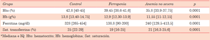 Para realizar nuestra comparación se estratificaron los pacientes en tres grupos. Grupo 1: control (sin anemia ni ferropenia); grupo 2: ferropenia aislada; grupo 3: anemia no severa (con o sin ferropenia y considerando Hb ≥ 10 g/dl).