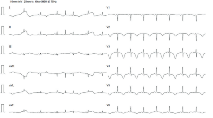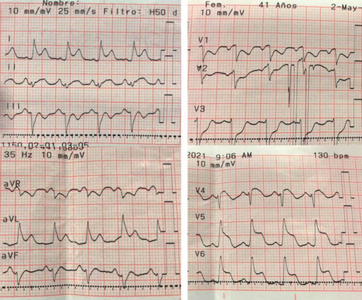 Fue trasladada a centro de tercer nivel en Montevideo, arribó a las 14 horas del inicio de la sintomatología, sin dolor y con examen físico normal. En emergencia se realizó dosificación de troponinas, que estaban elevadas (4.200 ng/ml a las 16 horas del dolor y 2.700 ng/ml a las 19 horas del dolor, para un punto de corte positivo > 0,060 ng/ml). El ionograma y la función renal eran normales. Del resto de la paraclínica se destaca leucocitosis de 12.700, VES y PCR normales. El electrocardiograma no presentó cambios respecto al previo.
