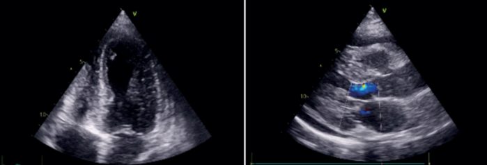 Se realizó un nuevo ETT que mostró aquinesia de todos los segmentos apicales y de los segmentos medios de la pared anterior y septal anterior, FEVI 38%, insuficiencia mitral e insuficiencia tricuspídea moderadas, hipertensión pulmonar (presión sistólica de la arteria pulmonar estimada en 62 mmHg) y derrame pericárdico leve sin repercusión hemodinámica.