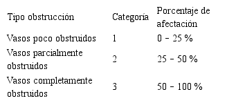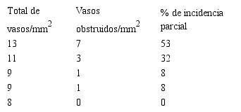 La afección varía desde un 53 % de vasos obstruidos en las zonas más cercanas a la médula, disminuye a 32 % en promedio en las muestras de la distancia 2 y desparece en la periferia como se observa en la Figura 6.