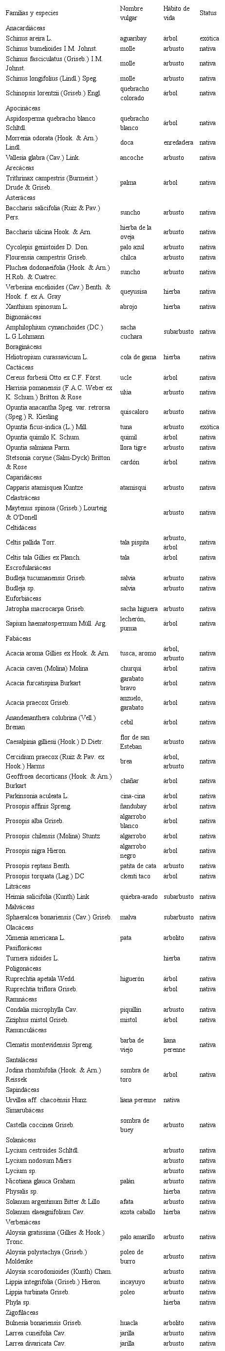 Bajo el término nativo se incluyen especies de la flora santiagueña, considerándose exóticas a las especies asilvestradas y escapadas de cultivo.
