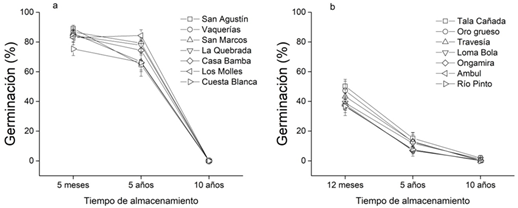 La capacidad germinativa de L. molleoides disminuyó el 74 % durante los primeros cinco años de almacenamiento y el 99 % al año 10 de almacenamiento, con porcentajes de germinación de 41,7 ± 2,0 %, 10,7 ± 1,5 % y 0,6 ± 0,3 %, en el año de recolección, a los cinco años y a los 10 años de almacenamiento, respectivamente (ANAVA de medidas repetidas, n = 66, p < 0,001). No se encontraron diferencias en la capacidad germinativa entre sitios de recolección (p = 0,2), ni efecto de la interacción (interacción tiempo de almacenamiento x sitio de recolección, p = 0,8; Figura 1b).