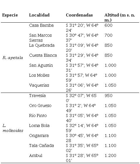 Entre enero y junio de 2008 se recolectaron frutos maduros de todas las ramas accesibles de 64 árboles semilleros de R. apetala y 66 árboles semilleros de L. molleoides, distribuidos en siete sitios (Tabla 1). Las semillas se secaron a la sombra a temperatura ambiente y luego se almacenaron en bolsas de papel a temperatura y humedad ambiente, en una vivienda ubicada en una localidad serrana (S 31º 28’, W 64º 33’, 745 m s. n. m., temperatura media de 15 °C y variación en las medias diarias de entre 9,5 °C a 26 °C). Los ensayos de germinación luego se realizaron durante el primer año de la recolección y a los cinco y 10 años de almacenamiento.