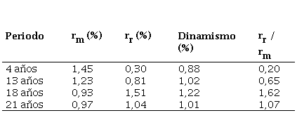 El mayor dinamismo de las especies principales agrupadas se produjo a los 18 años de la primera medición (Tabla 5) como resultado de un incremento del 50 % de la tasa de reclutamiento con relación al primer período.