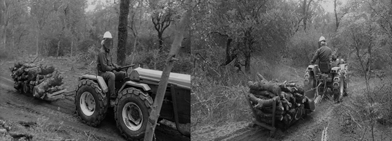 Históricamente, la operación tradicional de extracción conocida localmente como rodeada, se realizaba por medio de un carro de dos ruedas denominado zorra, traccionada por una mula (Turc y Mazzucco, 1995). Desde hace algunos años esta modalidad de extracción es cada vez menos frecuente, utilizando en su lugar un tractor agrícola sin ninguna modificación adicional, con uno o dos acoplados que ingresan dentro del monte para realizar el transporte desde el pie del árbol hasta su destino final. Esta opción mecanizada de transporte con tractores agrícolas, conviene ya que las trozas aprovechadas son de escaso volumen, el terreno no es abrupto y en la zona es más fácil conseguir estas máquinas agrícolas, que máquinas forestales especializadas (Dykstra y Heinrich, 1996).