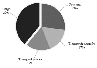Como puede observarse, se verifica un mayor tiempo en la actividad de carga (39 %), seguido por la descarga (27 %) y por último el tiempo de los traslados (17 %) son similares. Concentrando un 66 % del tiempo invertido en las dos primeras actividades.