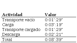 Según Tabla 2, la actividad del ciclo de extracción que más tiempo consume es la “Carga” (0:03’:19”), seguido de la “Descarga” (0:02’:21”) y tanto el “Transporte vacío” como el “Transporte Cargado” (0:01’:29”) se mantienen iguales. Sumando un tiempo promedio por ciclo de trabajo de 0:08’:39”.