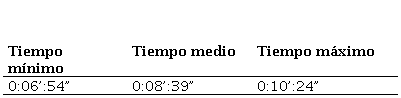 Los valores mínimos, medios y máximos de los tiempos promedios por ciclo de trabajo son 0:06’:54”, 0:08’:39” . 0:10’:24”, respectivamente. Presentando una desviación respecto a la media de 0:01’:45” por ciclo de trabajo, como se presenta en la Tabla 3. Sin embargo, estos resultados difieren con estudios previos en los que se plantea un tiempo de 5’ para el “ciclo medio de extracción” de leña con mula y zorra (Turc y Mazzucco, 1995).