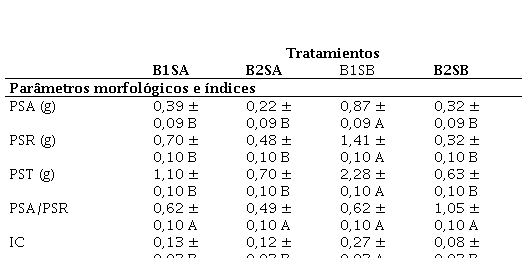 Los valores en la tabla expresan la media ± error estándar. Letras iguales para cada fila simbolizan que las medias no son significativamente diferentes (p>0,05) en test DGC, PSA= peso seco aéreo, PSR= peso seco radicular, PST= peso seco total, PSA/PSR= peso seco aéreo/radical e IC= Índice de Dickson.