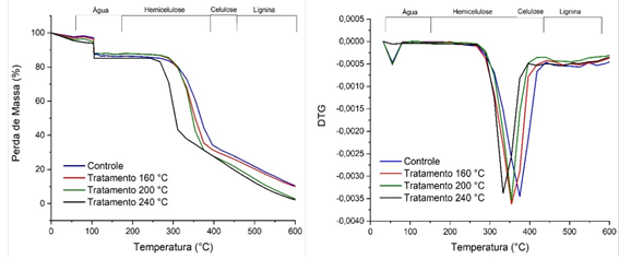 Foram efetuadas as análises termogravimétricas no equipamento NAVAS TGA 1000 com uma análise para cada tratamento, podendo observar a degradação da celulose, hemicelulose, lignina e extrativos em relação aos tratamentos empregados, com uma vazão constante de 2L.min-1. As curvas termogravimétricas foram obtidas a partir de 0 °C até a temperatura máxima de 600 ºC, com taxa de aquecimento de 10 °C.min-1. Para tanto foi avaliada a curva termogravimétrica da perda de massa em função da temperatura (TGA) e posteriormente foi realizado a primeira derivada da curva (DTG).