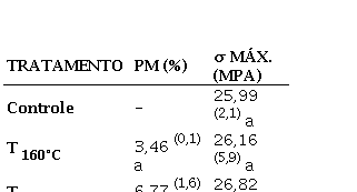 Quando analisado a dureza Janka, os tratamentos T 160 °C e T 200 °C, não demonstraram variações significativas, para o tratamento T 240°C, notou-se um decréscimo significativo, quando comparado ao controle. A tensão máxima (σ Máx) relacionada aos dois primeiros tratamentos (T 160 °C e T 200 °C), não apresentaram decréscimo em relação ao controle, Boonstra et al. (2007), relatou valores não significativos para temperaturas próximas de 165 °C em relação as propriedades mecânicas avaliadas, o que estão de acordo com o que está constatado nesse estudo. Isso decorre em função da modificação nos constituintes químicos da madeira na realização do tratamento térmico. Segundo Calonego et al. (2013) e Esteves & Pereira (2009), o decréscimo correlaciona-se principalmente com a degradação das hemiceluloses em função das elevadas temperaturas às quais as madeiras são submetidas.